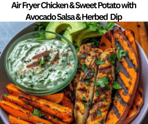 Make your Air Fryer Chicken & Sweet Potato with Avocado Salsa & Herbed Dip in 35 minutes. Preparing this bowl is easy, and it is tasty. A single serving of this dish contains 450 calories. Your bowl will be full of fiber, proteins, and healthy fats. You need boneless chicken breasts, sweet potatoes, avocados, Greek yogurt, olive oil, a few vegetables, and seasonings to make this bowl. Pair this Air Fryer Chicken & Sweet Potato with Avocado Salsa & Herbed Dip with salad for your meal. You can freeze grilled chicken and sweet potatoes and store them for two months. Enjoy serving this bowl at different parties, family occasions, and gatherings.