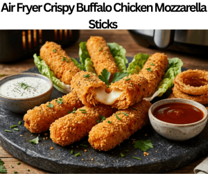 Air Fryer Crispy Buffalo Chicken Mozzarella Sticks are a spicy and flavorful dish. It contains chicken, buffalo sauce, mozzarella cheese sticks, breadcrumbs, all-purpose flour, eggs, seasoning, and cooking spray. These ingredients are simple and obtainable simply in the supermarkets or might even present in kitchen. You can make these sticks as an appetizer or for game day. Air Fryer Crispy Buffalo Chicken Mozzarella Sticks prepare quickly in only 23 minutes, so it is perfect to make for an end-of-minute party plan. This dish contains mozzarella cheese, so it is not safe for people with dairy intolerance as well. Use the dairy-free cheese sticks for this purpose. Serve these sticks with ranch dips, lettuce wraps, or onion rings for the flavorful combination. It stores easily, so we can easily make them in advance.