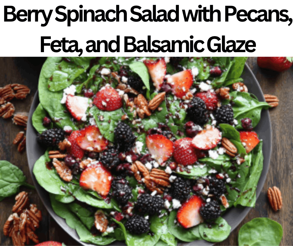 This Keto Berry Spinach Salad with Pecans Feta and Balsamic Glaze has savory elements and a glossy texture. We prepare this spinach salad with strawberries, olive oil, baby spinach, pecans, blueberries, balsamic glaze, apple cider vinegar, salt, feta cheese, black pepper, and Dijon mustard. This spinach salad contains 220 calories and six grams of net carbs. We make this spinach salad in just fifteen minutes. This Keto Berry Spinach Salad with Pecans Feta and Balsamic Glaze is ideal for appetizers, busy days, sides, morning meals, special occasions, activities, lunches, short events, get-togethers, parties, functions, and dinners. We do not advise preserving this spinach salad, as the fresh greens and berries will lose their texture. But you can prepare this salad earlier, as it refrigerates nicely for 2 days. You can serve this spinach salad with Garlic Butter Shrimp, Grilled Lamb, or Tuna Salad.