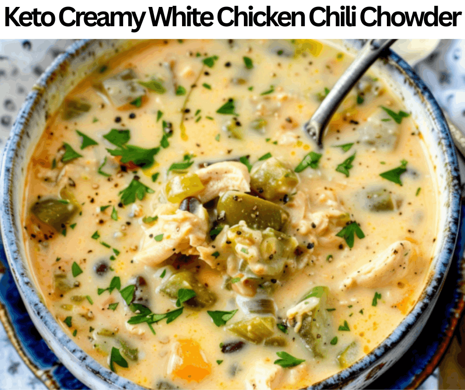Keto Creamy White Chicken Chili Chowder is a flavorful and delicious dish with a reduced carb count. We cook this dish with different kinds of ingredients such as cilantro, onion, heavy cream, garlic, butter, sour cream, oregano, chicken broth, olive oil, green chilies, chili powder, cumin, salt, xanthan gum, black pepper, paprika, chicken breast, and cream cheese. All of these components are simple and basic, so you can easily find from stores, and they may be available at your home. They have a strong, warm, and spicy taste. This chili chowder has 4 g of net carbs in one portion size. We can prepare it in advance. Keto Creamy White Chicken Chili Chowder is perfect for weekends, gatherings, lunch, and dinners. We freeze this recipe for two months. This dish requires 50 minutes to cook completely without any difficulties. Serve this dish with avocado slices and crispy bacon.