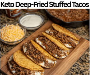 These Keto Deep-Fried Stuffed Tacos have a crunchy texture and juicy flavor. We prepare these stuffed tacos with mozzarella cheese, garlic powder, paprika, avocado oil, ground beef, cream cheese, onions, salt, keto tortillas, cheddar cheese, and cumin. These stuffed tacos contain 320 calories and four grams of net carbs. We make these stuffed tacos in almost thirty-five minutes. These Keto Deep-Fried Stuffed Tacos are perfect for appetizers, events, morning breakfasts, parties, occasions, lunches, get-togethers, sides, functions, and dinners. We store these stuffed tacos in a freezer for 20-30 days, so you can prepare them easily before the requirement. You can serve these stuffed tacos with Shredded lettuce, Sour cream, Cauliflower rice, or Sparkling water with lime.