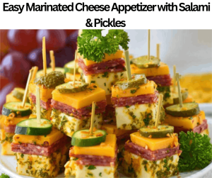 This Keto Easy Marinated Cheese Appetizer with Salami & Pickles has a rich and creamy texture. We prepare this cheese appetizer with olive oil, Italian seasoning, salt, red pepper flakes, salami, cheddar cheese, dill pickles, black pepper, apple cider vinegar, mozzarella cheese, garlic powder, and parsley. This cheese appetizer contains 280 calories and 3 grams of net carbs. We make this cheese appetizer in only fifteen minutes. This Keto Easy Marinated Cheese Appetizer with Salami & Pickles is ideal for starters, short events, sides, weekday breakfasts, special parties, occasions, lunches, functions, snacks, hectic days, celebrations, and dinners. We do not advise preserving this appetizer, as the pickles and cheese will grow soggy and lose their texture. You can serve this cheese appetizer with Prosciutto-Wrapped Asparagus, Zucchini Ribbon Salad, Flaxseed Crackers, Creamy Herb Dip, Pickled Jalapeños, or Dry Red Wine.
