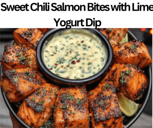 - Put the warm salmon bites on a plate with lime yogurt dip on the side, and then eat them