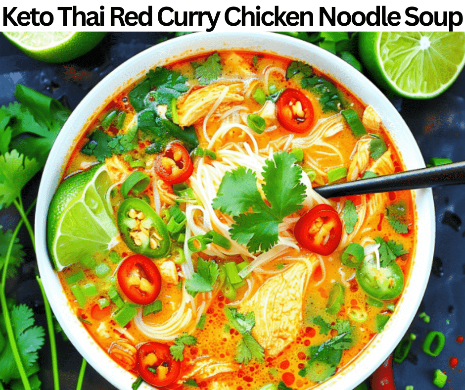 Keto Thai Red Curry Chicken Noodle Soup boasts strong Thai flavors without added carbohydrates. Simmering in an aromatic Thai Red curry coconut soup that is creamy, spicy, and slightly acidic from the lime juice are tender chunks of chicken. Shirataki noodles work well for soaking up the thick sauce and are a light and keto-friendly alternative to regular noodles. The added spinach and herbs provide the ideal amount of freshness, creaminess, and spice with every spoonful. This soup tastes like it came from your favorite Thai restaurant. This Keto Thai Red Curry Chicken Noodle Soup is light enough for a short weekday meal yet still warm enough for a chilly evening. Add some extra zing by garnishing it with chopped chilies, lime wedges, or cilantro.