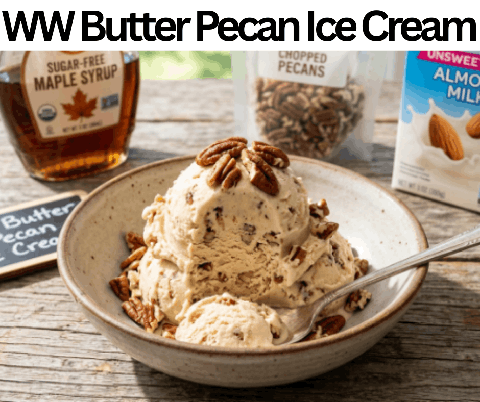 The WW Butter Pecan Ice Cream is a delicious dessert. You can make it in only four hours and fifteen minutes. The four hours will be for the freezing of your dessert. You need 10 min to make and five minutes to cook this ice cream. Serve this WW Butter Pecan Ice Cream for occasions, parties, events, and hot summer days. We will add salt, cold water, cornstarch, chopped pecans, light butter, vanilla extract, sugar-free maple syrup, non-fat Greek yogurt, and unsweetened almond milk to make it. You can also keep it frozen for two weeks.