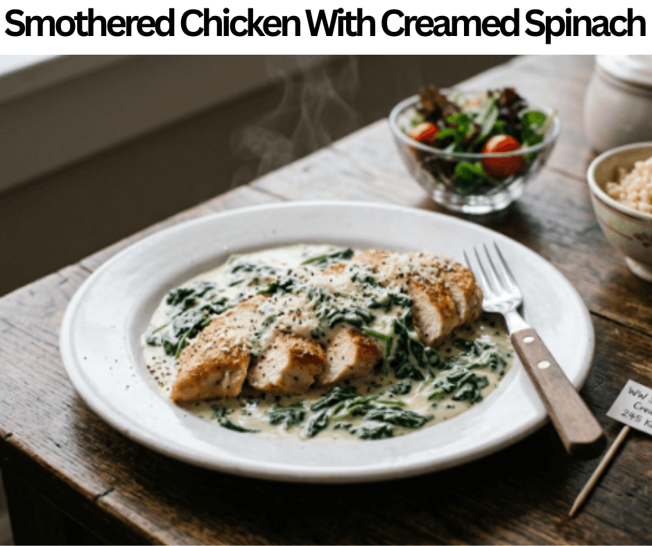 The WW Smothered Chicken With Creamed Spinach is a delicious dish. There are 245 kcal per serve in this recipe. You will prepare it in only 30 minutes. There are a few kitchen tools to make this dish. Serve this WW Smothered Chicken With Creamed Spinach for occasions, family dinner, or even events. Also, you can eat this dish with vegetables, rice, or salads. The instructions to prepare this recipe are very simple. We will use boneless & skinless chicken breast, low-calorie cooking spray, grated Parmesan cheese, unsweetened almond milk, light cream cheese, spinach, and seasonings in this recipe. You may also put this dish in a closed vessel to chill for three days.